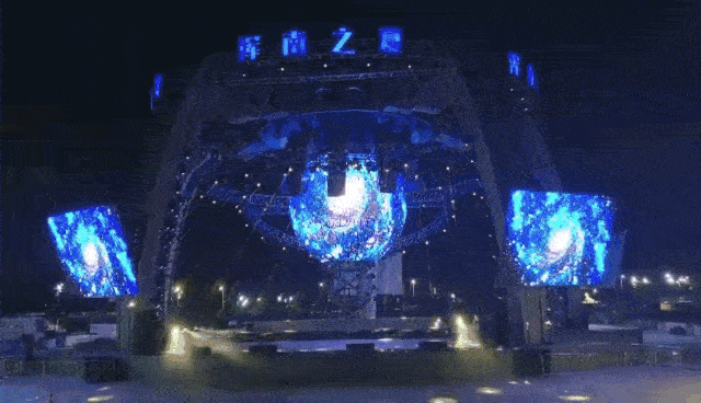 中央懸掛的高清多維球形屏幕,由512塊單體屏幕包裹而成,采用的是金立翔戶外P5間距LED屏,配合頂部的機械手裝置造型,為演出呈現(xiàn)精彩絕倫的立體特效,帶領觀眾穿梭時空,打造出既熱烈又炫酷的現(xiàn)場氛圍。